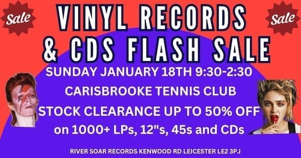 This is the sort of event that starts as โIโll just have a quick lookโ and ends with you carrying a stack of vinyl like you have suddenly become a DJ. River Soar Records are doing their biggest clearance sale with thousands of LPs, 45s, 12 inch records, CDs and T shirts, with discounts up to 50% off. There will also be new premium stock if you want something shiny instead of rummage glory.